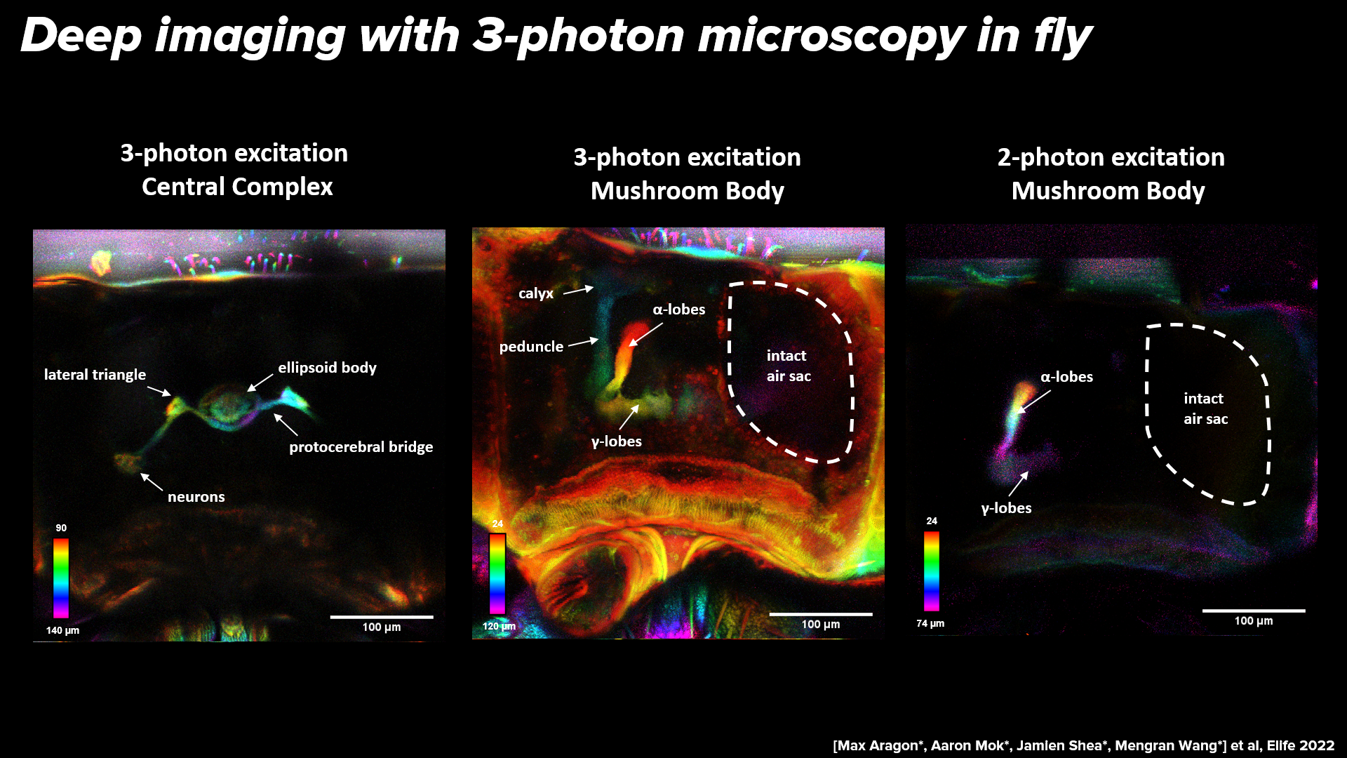 We have improved the fluorescence signal generation efficiency of three-photon microscopy, achieving an imaging field two order of magnitudes larger than traditional three-photon microscopes in deep brain regions with cellular resolution.