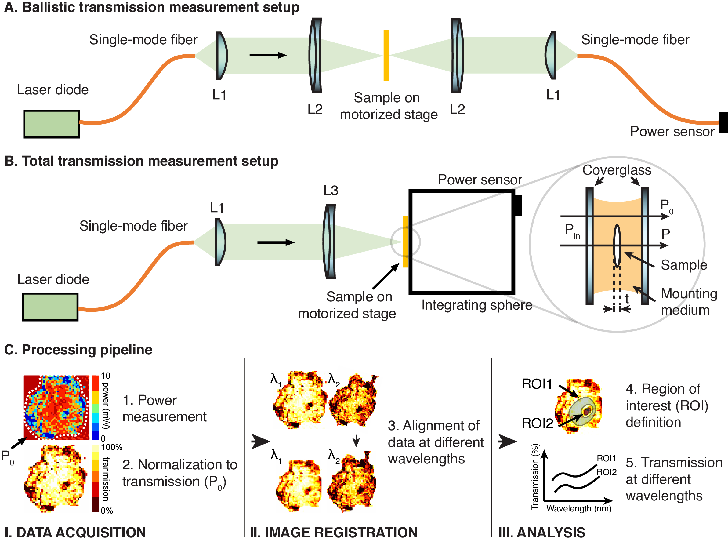 We built a simple and versatile spectrometer to measure tissue ballistic and total transmission with customizable wavelength range, spatial resolution, and sample sizes.